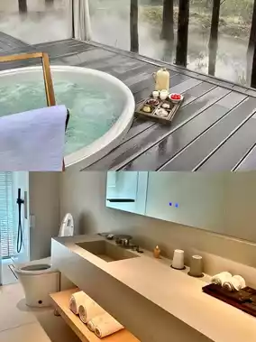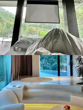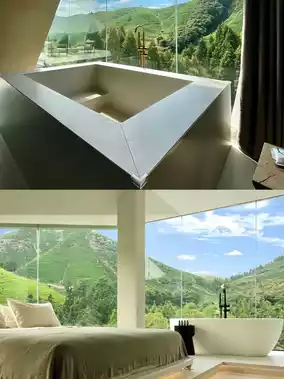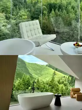 1⃣The room has a large 270° view bathtub🛁, and I felt like I was floating in the clouds while bathing🍃~ I woke up to a mountain view and the room was well-equipped with a large screen projector and complete toiletries!