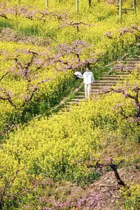 Thousands of acres of peach and rapeseed flowers are planted in the scenic area. From the air, from the observation deck, from the stone road, you can see the sea of spring flowers like the ocean. Walking into the sea of flowers, you can see the fragrance of flowers, grass and mud everywhere🌸