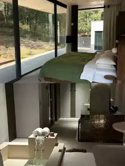 The glass door of each guest room leads to the pine forest backyard. The gray space blends with nature, and the independent suspended landscape platform further strengthens the connection with the valley. Guest rooms are separated by plants and low walls to ensure privacy, and local plants are selected to soften the boundary between architecture and nature. At night, lights dot the path like fireflies, creating a low-key secluded atmosphere. Songjing Manor's seamless design, from privacy to openness, and then to natural connectivity, brings a pleasant secluded living experience. Everything from the spatial structure to the layout details has been carefully considered, allowing the building, space and people to blend into the natural mountains and forests, creating a boundless secluded place.