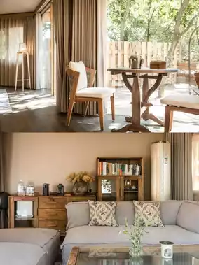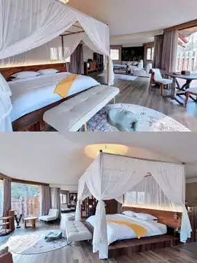 Nine tent guest rooms are scattered like little mushrooms on the hillside, each with its own private courtyard. Draw the curtains, and it's your own personal sanctuary! The 2-meter-wide bed is incredibly soft, and amenities like a smart toilet and minibar are all provided. In the evening, the butler delivers warm milk and mosquito repellent, ensuring total comfort and safety! 🛌✨