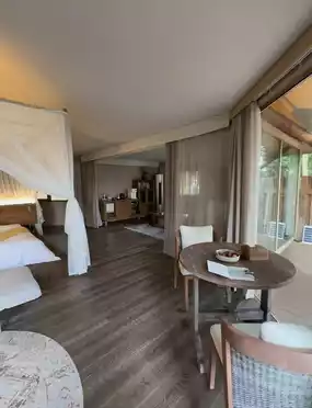 - Tent Rooms: Each tent room starts at 70㎡, featuring a private courtyard or outdoor platform, combining privacy and open space. Rooms are named after the Big Dipper's seven stars (such as Tian Shu, Tian Xuan, Tian Ji, etc.), with an interior design of natural wood and panoramic floor-to-ceiling glass windows that bring the natural mountain scenery indoors.