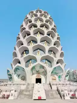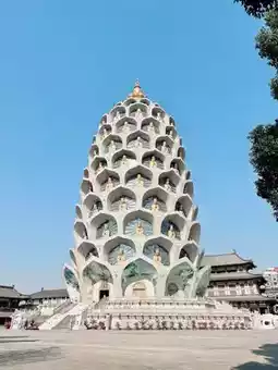 ✔️The appearance of Baolin Guanyin Pavilion resembles a blooming lotus, with a Buddha statue on each petal. From a distance it looks like a golden pineapple, so many people also call it the golden pineapple. Inside the Guanyin Pavilion are the indoor Guanyin statues. The three Guanyin statues look like they are facing forward no matter from which side you look at them.
