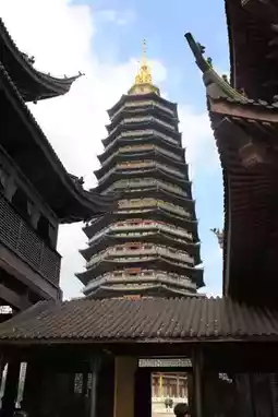 A landmark of Changzhou, with yellow walls, a temple, and Tianning Pagoda.