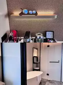 All room types have open terraces overlooking Shunshan scenery. I stayed in an Executive King Room where the view is right outside your window. The layout is very similar to the Sanya EDITION! The 42 sq m space is super spacious, with natural wood tones and a sloped roof, creating a relaxed and comfortable feel. The bathroom fixtures are Hansgrohe, with a PG bathtub and Dyson hair dryer - this configuration completely won me over! The mini bar is complimentary for the first round, and the capsule coffee machine and direct drinking hot water machine are also very thoughtful.