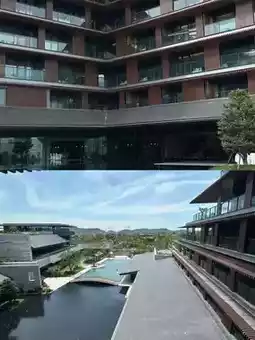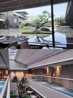 The architecture features Jiangnan residential style with black, white, and gray tones, plus small bridges, flowing water, green plants, and rockeries, creating a full ink-painting Jiangnan atmosphere. The fireplace in the lobby bar is super stylish and 100% photogenic!