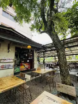 coffee, and a full range of drinks, served in a warm wooden house atmosphere. It is perfect for sitting and chatting and eating comfortably.