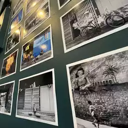 The interior is decorated in a cool, dark tone with black and white photos plastered all over the walls, giving it an artistic feel. There's a small, private seating area perfect for relaxing and sipping coffee. If you love vintage photography or a rugged, cool vibe, this is a must-try.