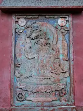 On the archway at the back, there are carvings of the golden-winged Garuda and the Eight Treasures of Buddhism, which are distinct features of Tibetan Buddhism.