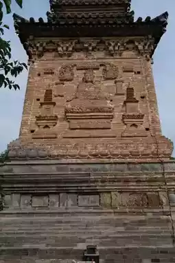 The tower is a square, hollow, thirteen-story, dense-eaves brick building with a remaining height of about 17 meters. The middle part of the tower base is waisted and carved with patterns of lotus, flames, musicians, etc. There were originally 24 groups on each side, and 14 groups remain now, each group is different.
