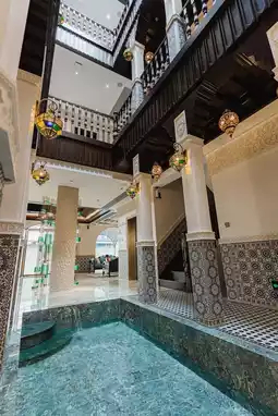 Mosaic handmade wall paintings, luxurious and heavy wooden railings,