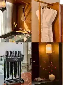 The room is also equipped with a small refrigerator, a large TV, a sunken bathtub, and more…