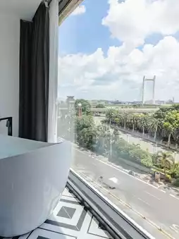 The room also has 270° floor-to-ceiling windows overlooking the river.