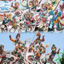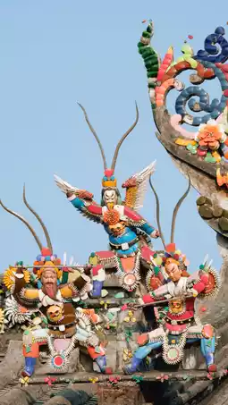 When traveling in Chaoshan, don't miss the Nianci art. You can easily find surprises in many temples, archways, and even ordinary houses. The small figures carved on the roof are decorated with colorful porcelain pieces, creating an exquisite beauty under the sunlight. Local artisans particularly enjoy transforming traditional operas into creative themes, allowing us to see model operas such as "Taking Tiger Mountain by Strategy," "Investiture of the Gods," and "Twenty-four Filial Exemplars" on the rooftops.