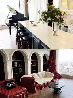 The common area features a piano, sofas, floor-to-ceiling windows, a capsule coffee machine, and a super photogenic rose wall 🥀. Taking photos here is an absolute must!