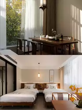 🛏️The rooms have king beds and double beds, with standard small refrigerators, projectors/large TVs, and sunken bathtubs. You can also immerse yourself in the Chaozhou Kung Fu tea experience~