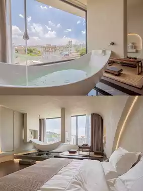 Super close to attractions - Paifang Street and Kaiyuan Temple right downstairs. Pure white design with various room types (king/twin beds, bathtub rooms). Surprise rooftop bar on 3rd floor with beautiful waterscape - perfect for proposals! Free laundry & 24h front desk. Ultra clean and comfy 😌