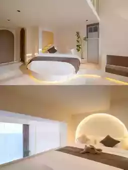 🌈 The room features a creamy Instagram-style design, with a duplex loft and two large beds, accommodating up to 4 people! Equipped with HD projection, sofa, makeup mirror, and more. Plus, there's a slide bubble pool and toys to keep the kids entertained.