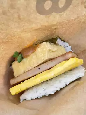 Popular meat and egg rice balls at Chatan American Village in Okinawa, Japan: Onigiri Breakfast