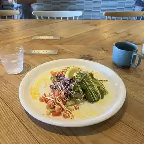 The location is amazing. #thecalifkitchen in #okinawa. There are outlets at the counter seats so you can work. The view from the terrace is like a painting of an ocean! I ordered the #americana for lunch. My favorite tortilla with salmon, avocado, and plenty of vegetables. It's delicious! Drinks are available for an additional 250 yen and you can also take it out! I definitely recommend you go. #coupletrip #gourmet #historicalsites #greatview #gourmettrip #gourmet #okinawa #okinawacafe #chatan #americanvillage #okinawatrip #okinawatrip #domestictrip