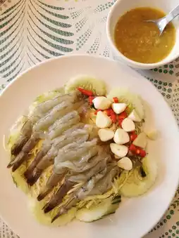 We ordered both styles: Steamed sea bass with lime, shrimp in fish sauce, and pork steak with black pepper sauce. The food was very delicious, just as my friend said. Steamed sea bass with lime and shrimp in fish sauce were very spicy and delicious. As for the pork steak, I was very impressed. I liked it very much. It was very delicious. The pork pieces were very large, soft, and not tough at all. The sauce was also very delicious. No wonder I saw almost every table ordering it.