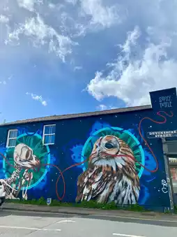 After, we passed the Church of St. Gregory the Great and took photos of the town library too as it was a lovely looking building. In Devonshire Street we saw an incredible mural painted on a wall of owls by possibly a ‘Sophie Tuttle.’