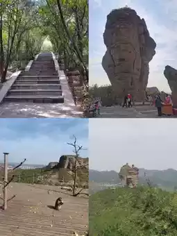 There is no need to take the cable car at Shuangta Mountain. Climb up the stairs and get closer to Shuangta Mountain little by little. Pay attention to the Imperial Chair Rock and Lover's Cliff in the distance. People gathered in a circle, which might be the appearance of macaques.