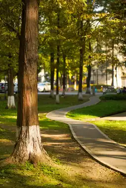 The sun shines through the forest onto the winding path
