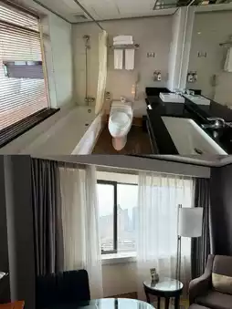 The rooms are very small... just like Home Inn. The bathtub 🛁 is embedded in the floor, and the shower 🚿 is inside the bathtub which makes the space quite cramped, but considering it was built last century, it's understandable that the minibar in the room is not free.