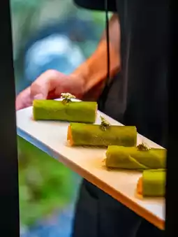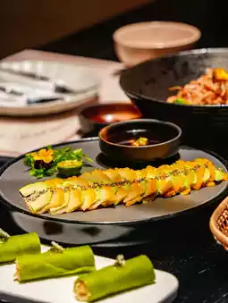 The skin is supposed to be made of spinach, and the inside is wrapped in crispy bamboo shoots, which are a very refreshing cold dish