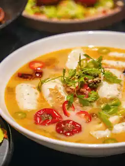 Vegetarian version of "sauerkraut fish"! The taste is very good, "fish meat" taste quite smooth and some gluten, may be mushrooms or other things made, the bottom side dishes are also apricot mushrooms, bamboo shoots, etc., the soup is delicious and not too salty very good