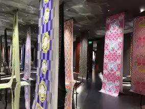 The center of the exhibition hall is a hollow hall with a large loom, called a Xiaohualou wooden loom, made during the Daoguang period of the Qing dynasty. It is 6 meters long, 1.5 meters wide, and 5 meters high, with two levels, and requires two brocade teachers to operate it together. This is the only Xiaohualou wooden loom still in use in the world and is considered the museum's treasure.