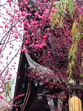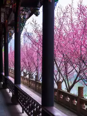 Enter through the south gate, and the fragrance of the flowers will cling to your clothes like mist. At the corner of Zhuojin Tower, you will see several red plum branches passing through the corridor, like a beautiful woman looking out the window with flowers in her hair. The ancient plum trees in front of Chongli Pavilion are the most beautiful, with their gnarled branches supporting the red flowers in the air, and the glazed eaves and the river waves complementing them. The light and shadow here are the most wonderful, with the morning sun shining on the plum branches and the evening light dyeing the flowers, and the copper bells on the eaves ringing in the wind, causing the red petals to fall on the carved railings.