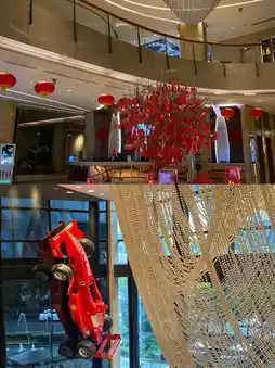 The circular canopy in the hotel's drop-off area is uniquely shaped, like a mysterious flying saucer, and the red racing car model hanging on the background wall of the lobby concierge desk adds a unique feature. Although the hotel has not been renovated since its opening, and the lobby and guest rooms are a little dated, they are still well maintained and have a unique charm.