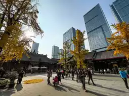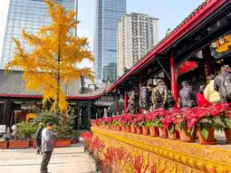 The weather in Chengdu in early winter is perfect for traveling, but the yellow ginkgo trees create a harmony between the beauty of the temple and the seemingly bleak downtown buildings.