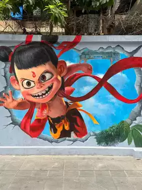 🐼 Nezha graffiti + super cute wall-climbing pandas! Turn onto Qinglian Street for Trip.Gourmet recommended cold pot skewers, around CNY 30 per person, you'll leave stuffed!