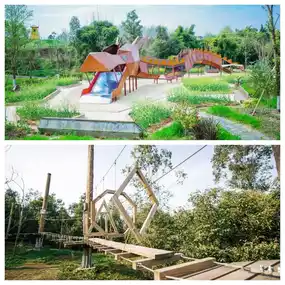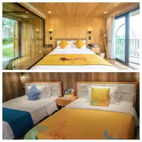 The hotel offers four themed room types: tree houses, beehives, tents, and idyllic wooden cabins, each a unique natural art gallery. Tree houses are nestled within a vibrant forest, offering lush greenery right outside your window. Beehive rooms, crafted from natural wood, feature spacious balconies with breathtaking views of a hidden floral paradise. Tent rooms resemble campsites scattered under the stars, where you can gaze at the Milky Way at night and wake up to gentle sunlight streaming through the glass curtain walls in the morning. The rooms are meticulously designed with families in mind, providing children's slippers, mini toiletries, folding clothes racks, and even thoughtfully placed bedside nightlights – a true lifesaver for parents traveling with little ones.
