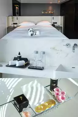 Staying in the Noble Residence King Room, the front desk staff were courteous and provided detailed introductions. Upon reaching the 60th-floor Noble Residence level, the panda plush and snack platter in the room instantly lifted my spirits. The cute panda welcomes every guest, and the room is spacious and comfortable with soft bedding and thoughtful lighting design. The facilities are modern and smart, with the minibar complimentary for the first use. The high floor offers breathtaking views—whether lying in bed or soaking in the tub, you can enjoy the city’s nightscape 🌃.