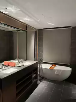 The double sink design is spacious and convenient. The standalone bathtub comes with a wooden tray, ideal for reading or enjoying aromatherapy while soaking. The entire bathroom exudes a modern minimalist vibe, with light and shadows playing beautifully on the stone walls, offering a soothing experience.
