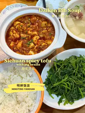 A very local eatery recommended by the hotel concierge. This place is known for their naohua tofu (mapo tofu with pork brains). It’s not as bad as it sounds but I was realllllyyyy oily and spicy so you might want to try their other dishes like stir fried ribs instead if this is not your thing. Their daikon pork ribs soup was good and HUGE - the bowl was larger than the size of my palm. Followed with a plate of stir fried yam leaves. Dishes were on the oily side but representative of the dishes in this region. Follow me for more food and travel recs in China. Chongqing and Beijing coming up!