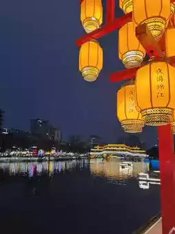 The bridge's eaves, the exquisitely carved railings, stand out against the night sky. Red lanterns hang high, their reflections blending with the rippling water, suffusing the entire Jinjiang River with a warm glow.