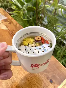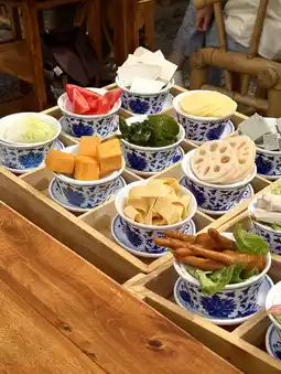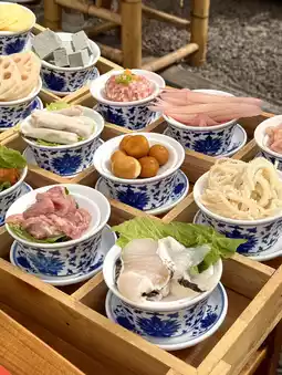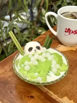 The atmosphere is lush and inviting, reminiscent of an ancient Chinese courtyard. Seating is available in both the air-conditioned area and the outdoor garden, surrounded by flowers. Perfect for a long getaway with friends or capturing beautiful photos for social media. A wide selection of ingredients are served in cute Chinese-patterned cups, including vegetables, meat, meatballs, and a variety of snacks. The mala soup is incredibly flavorful and fragrant with Chinese herbs. We recommend pairing it with a cold drink or a dessert: the adorable and delicious green panda mochi ice cream. This is another must-try when in Chengdu.