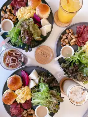 Bacon, dinner rolls, king oyster mushrooms, lettuce, scrambled eggs, fruit