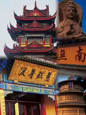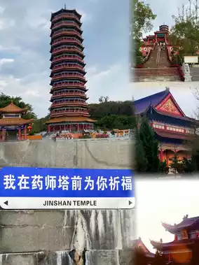 Jinshan Temple covers an area of 3,600 square meters, faces south with its back to the north, and consists of a three-tiered complex of three buildings each. The mountain gate is adorned with a popular couplet: 'Be at ease and observe the ease of observation, as the Tathagata appears as he is seen, and is seen as he appears.' Inside the second-tier Hall of Heavenly Kings, the Maitreya Buddha is enshrined, with a couplet on the hall door: 'The evening drum and morning bell awaken the world, questioning the pursuit of fame and fortune, while the sound of sutras and Buddha's name calls back those lost in the sea of suffering.' Above the third-tier main hall hangs a plaque inscribed with 'Daxiong Bao Dian' by Zhao Puchu, with a couplet on the hall door: 'Embrace the world in search of sweet rain to bathe in, as the blessed land of the great cosmos brings forth auspicious clouds.'