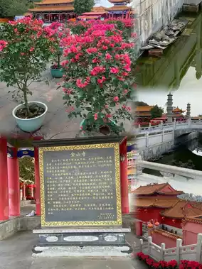 The entire Jinshan Temple, nestled against the mountain and beside the water, sits high and overlooks the surroundings. The Nandu River is like a jade belt, the Nanshe Ridge serves as prayer beads, the Kuihaikou welcomes the sunrise, and the Wuzhi Mountain looms among the clouds. Ascending to this temple, one can see the vast expanse of the river and the lush green riverbanks, which refreshes the mind and delights the spirit!