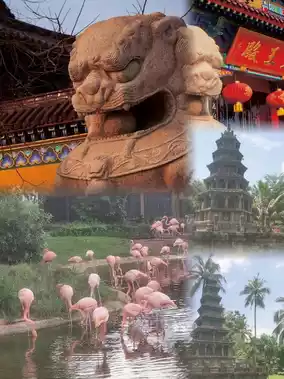 One might say that the Jinshan Temple in Hainan captivates visitors with its extraordinary elegance; but rather, it is the statues of various shapes and expressions that enchant the beholders. Upon entering the temple gate, one is immediately confronted by two imposing door guardians, with eyes wide open and weapons in hand, standing vividly on both sides. Ascending the steps to the Hall of Heavenly Kings, one sees the big-bellied Maitreya Buddha laughing heartily, flanked by six tall deities with different expressions—some with mouths agape, some with glaring eyes, some raising hands, some waving arms, some with red faces, and some with black faces; enough to startle the faint-hearted at first sight. Climbing further to the top, one is greeted by the magnificent and resplendent Tathagata Buddha's main hall. The golden body of the Tathagata Buddha is towering and radiant, seated cross-legged with a gentle smile; his compassionate demeanor and smiling face remind one that the Buddha is silently 'illuminating all with the light of Buddha, saving all beings.'