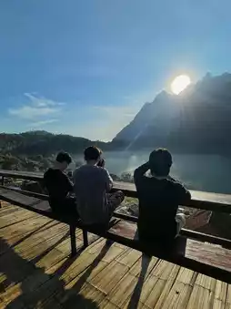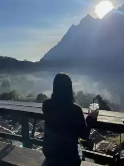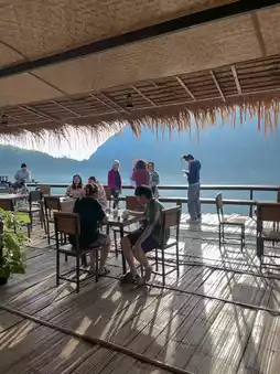 Baan Lisu Homestay is a popular accommodation in Chiang Dao with beautiful photo spots, but it fills up very quickly. Don't worry if you can't book in time because they also have a cafe. We just found out. We walked around looking for a photo spot for a long time. Looking down from the viewpoint, why are there so many people walking into this shop? So we decided to walk down and take a look. It turned out that they also sell drinks. There are quite a few seats. Even though we came on a holiday, it didn't feel crowded. The air was great. But we arrived when the sun was out, so it didn't look very beautiful. It's a bit of a shame. Anyone who wants to come, hurry before the sun rises. The photo spots here are really beautiful. You can see Doi Luang clearly. It's awesome!!!