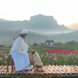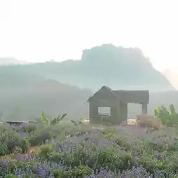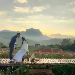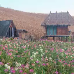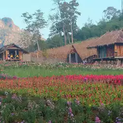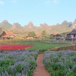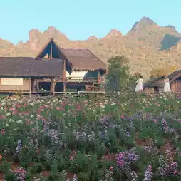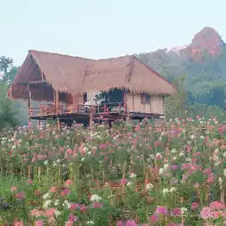 In front of every house is a field of flowers and a bamboo bridge that stretches to the balcony with a view in front of Phu Pha Mok, where white fog floats to greet you in the morning.