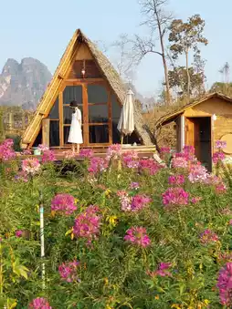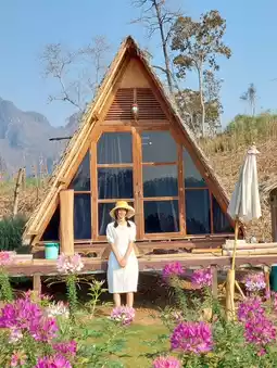 "Rai Phu Pha Mok" in Chiang Dao District, Chiang Mai Province. This is a small accommodation in the middle of a valley, hidden amidst nature with cool air, especially in the morning and evening when the mist floats slowly across the fields. There is a gentle breeze and the fragrance of the forest trees. The atmosphere invites you to forget the chaos for a moment.