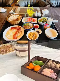 When night falls, shabu is served in front of our room. Enjoy the view of Doi Luang Chiang Dao and the sunset. So satisfying! :) For breakfast, we have a set of rice porridge with side dishes and an American breakfast, complete with fruit, orange juice, tea, coffee, and yogurt.