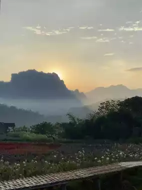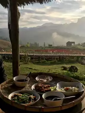 🌤️ In the morning, enjoy simple but delicious local food, complemented by a sea of mist. There are plenty of photo opportunities, including panoramic views of flowers, mountains, and mist.